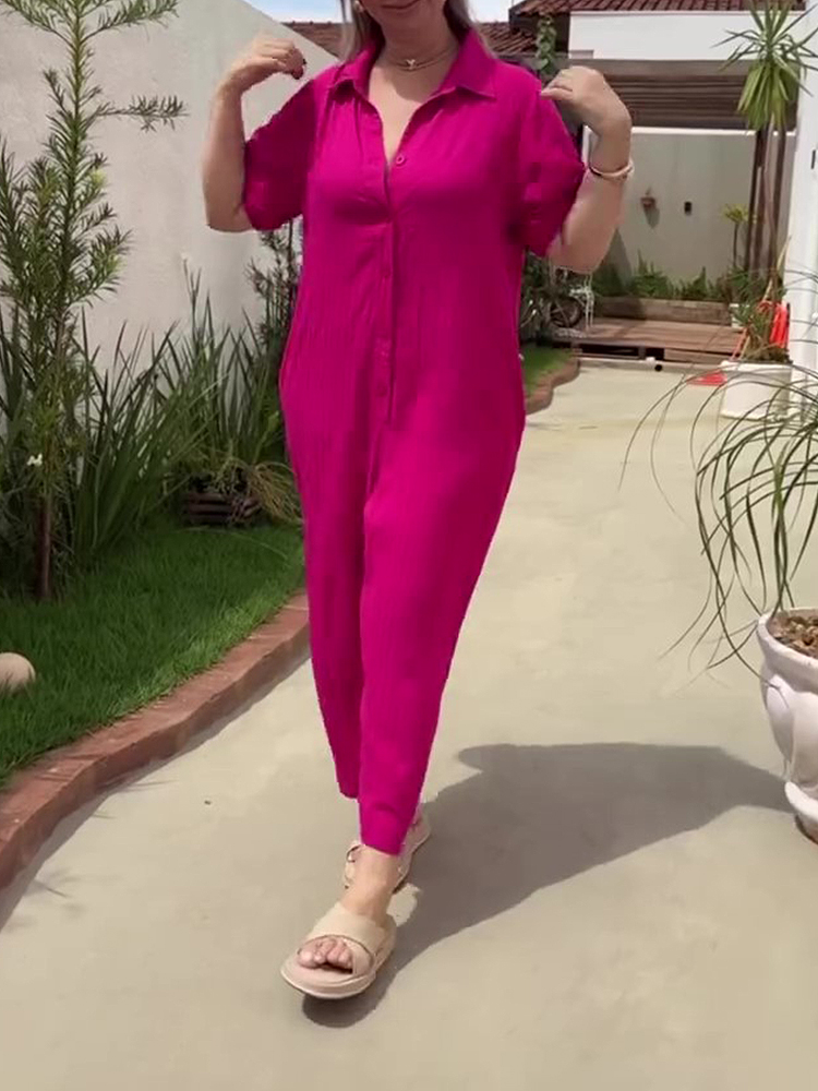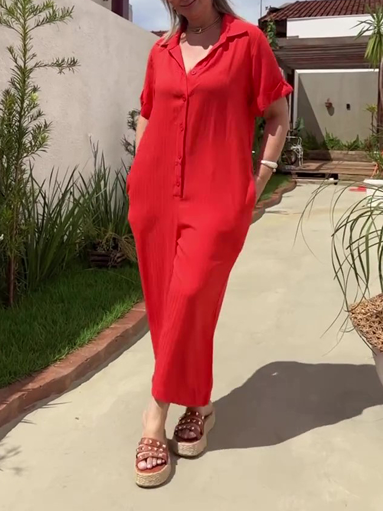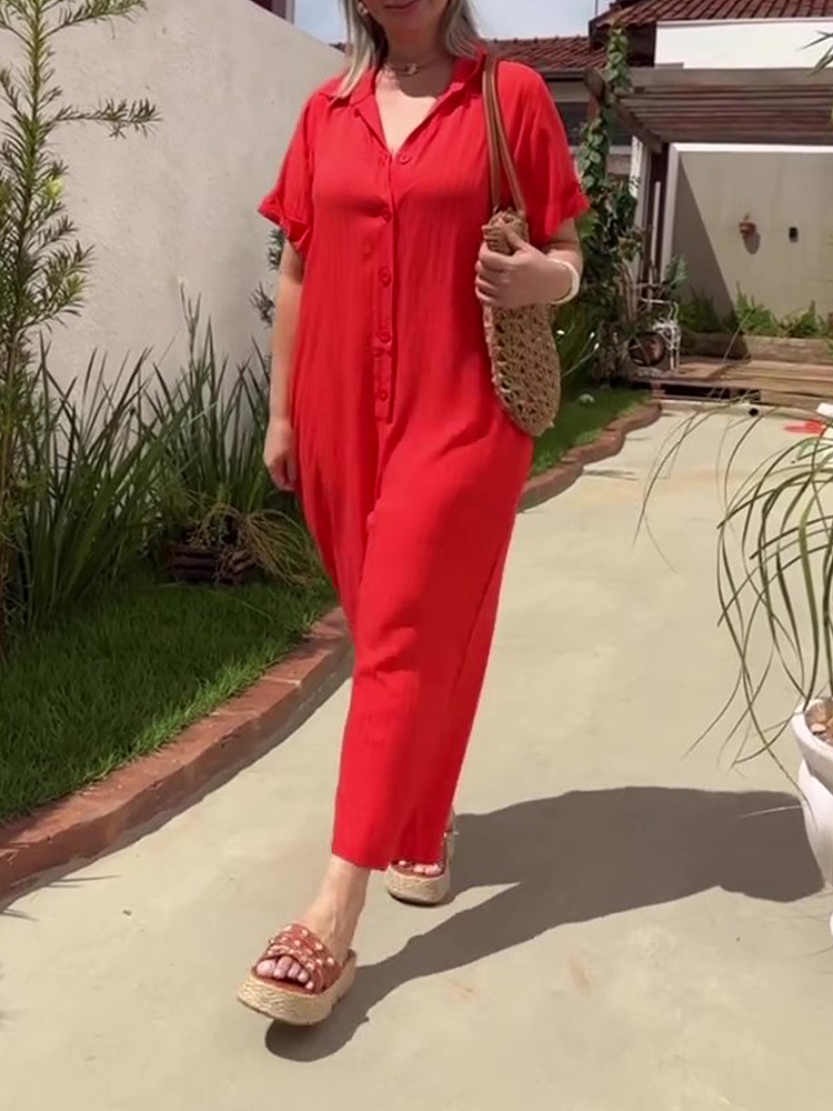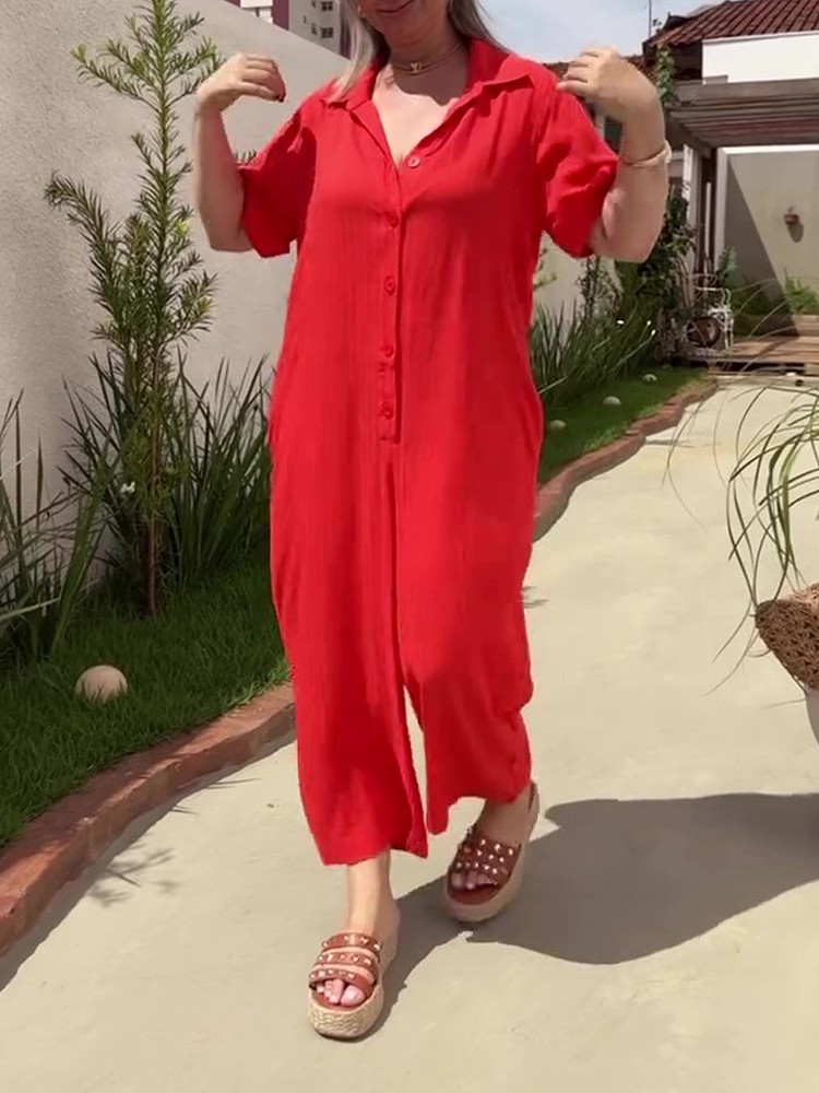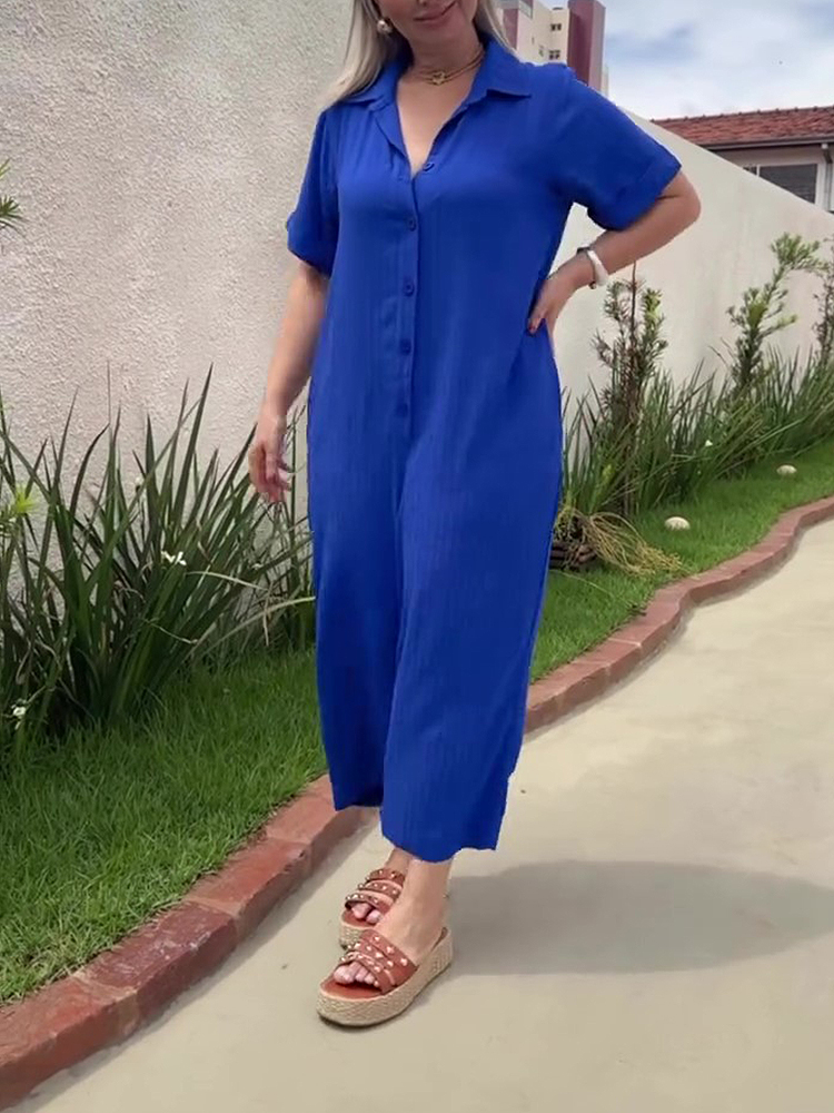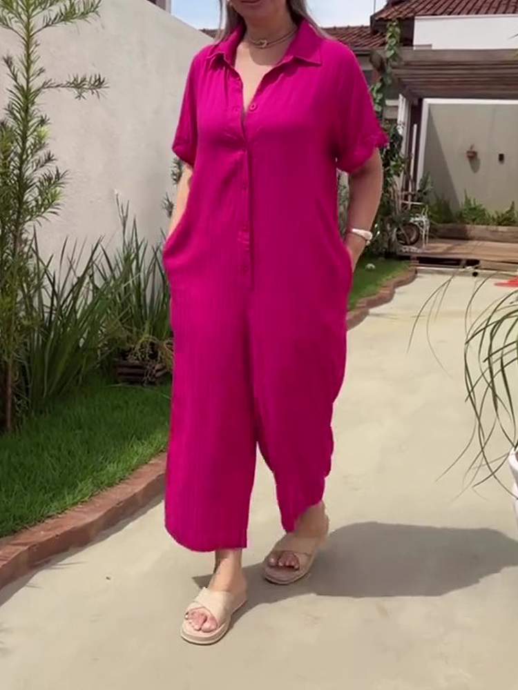 Plus Size Shirt Lapel Button Down Short Sleeve Jumpsuit