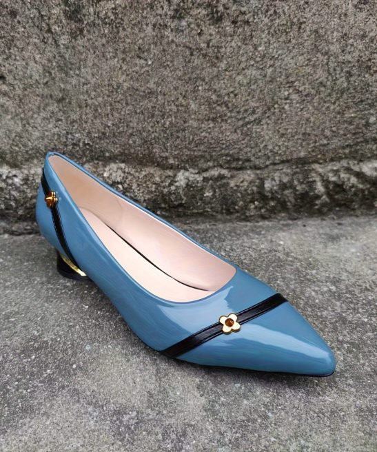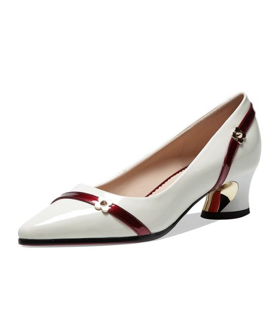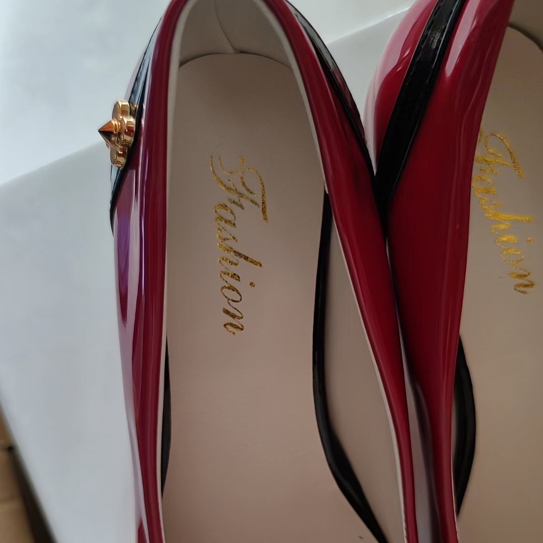 Women’s Pointed Toe Block Mid Heels, Flower Decor Patent Leather Slip On French Heel Shoes, Versatile Heels